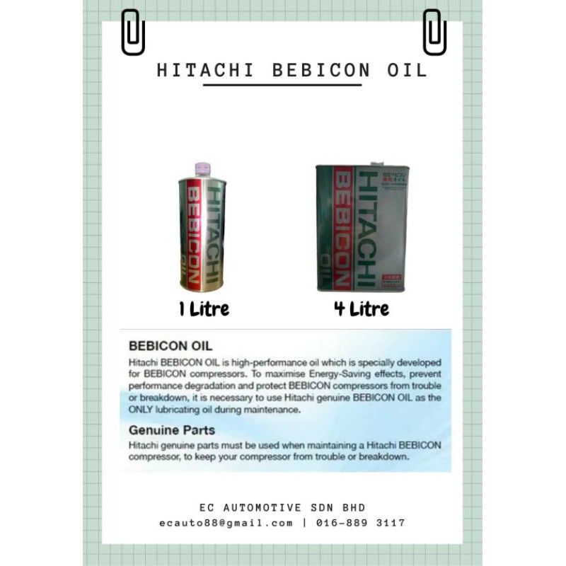 Hitachi believes that our bebicon compressor can satisfy your various needs and help you grow your business... History of hitachi bebicon® 1975 1980 1946 birth of hitachi bebicon 1960 birth of two satage bebicon 1965 birth of oil free bebicon birth of electronic package bebicon l type v series new v series n type list of model 0.4 0.75 1.5 2.2 3. The compressor is designed to operate long hours. Suitable for manufacturing industries that range from electronics to food and beverage... The hitachi oil free bebicon compressor is a heavy duty piston compressor designed to operate long hours.